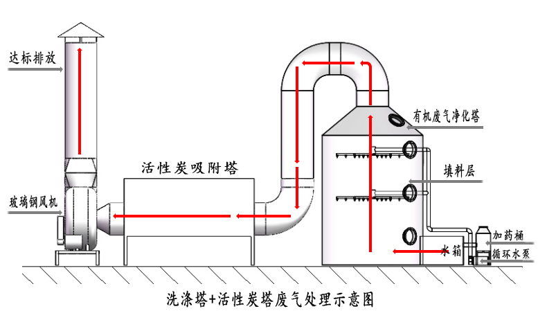 根據氨氣廢氣易溶于水的特點,我們采用噴淋塔+活性炭吸附對氨氣廢氣進行處理。噴淋塔內部含有填料過濾和水噴淋,伴有加藥系統,添加稀硫酸溶液進行吸收。氨氣接入設備后自下而上游走,經過下層的填料層過濾,然后經過自上而下加了稀硫酸溶液的噴淋系統進行吸收,氨氣溶于水流至底部的水箱。經循環泵作用重復使用,經過一段時間,更換水箱中的水。最后經過后端活性炭吸附箱吸附后達到排放標準。