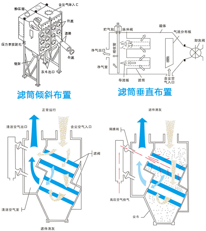 濾筒除塵器的結構是由進風管、排風管、箱體、灰斗、清灰裝置、導流裝置、氣流分流分布板、濾筒及電控裝置組成。含塵氣體進入除塵器灰斗后,由于氣流斷面突然擴大及氣流分布板作用,氣流中一部分粗大顆粒在動和慣性力作用下沉降在灰斗;粒度細、密度小的塵粒進入濾塵室后,通過布朗擴散和篩濾等組合效應,使粉塵沉積在濾料表面上,凈化后的氣體進入凈氣室由排氣管經風機排出。