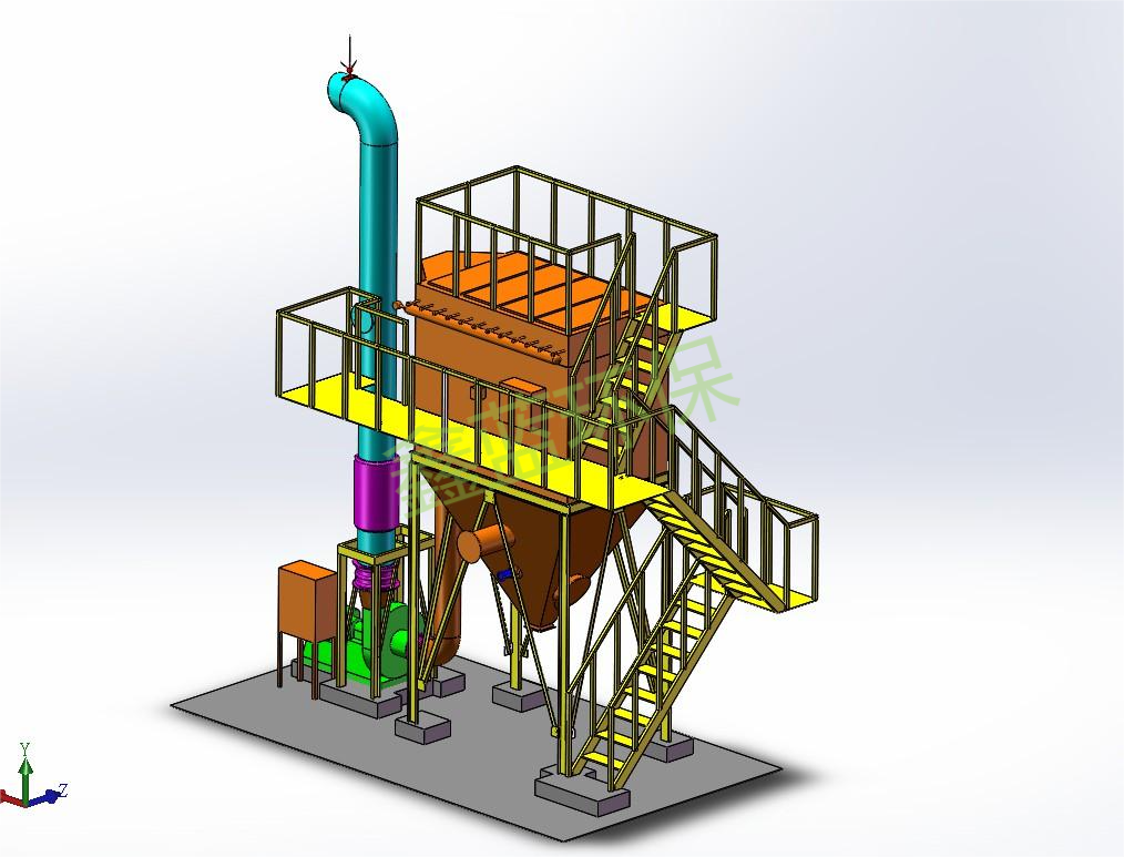 2.濾室:濾室包括花板、濾袋組件、灰斗、煙氣進口煙道等。濾袋材料是一種柔性透氣介質,通常由針或薄膜材料制成。濾袋由金屬籠骨支撐,以免過濾時被吸收。濾袋和龍骨作為一個整體懸掛在花板上。灰斗安裝在濾室下方,灰斗通常作為煙氣進口。灰斗中的導流板用于吸收進口煙氣高速運動顆粒的動能,分配進口氣流,保護濾袋免受磨損,使各濾袋負荷均勻。