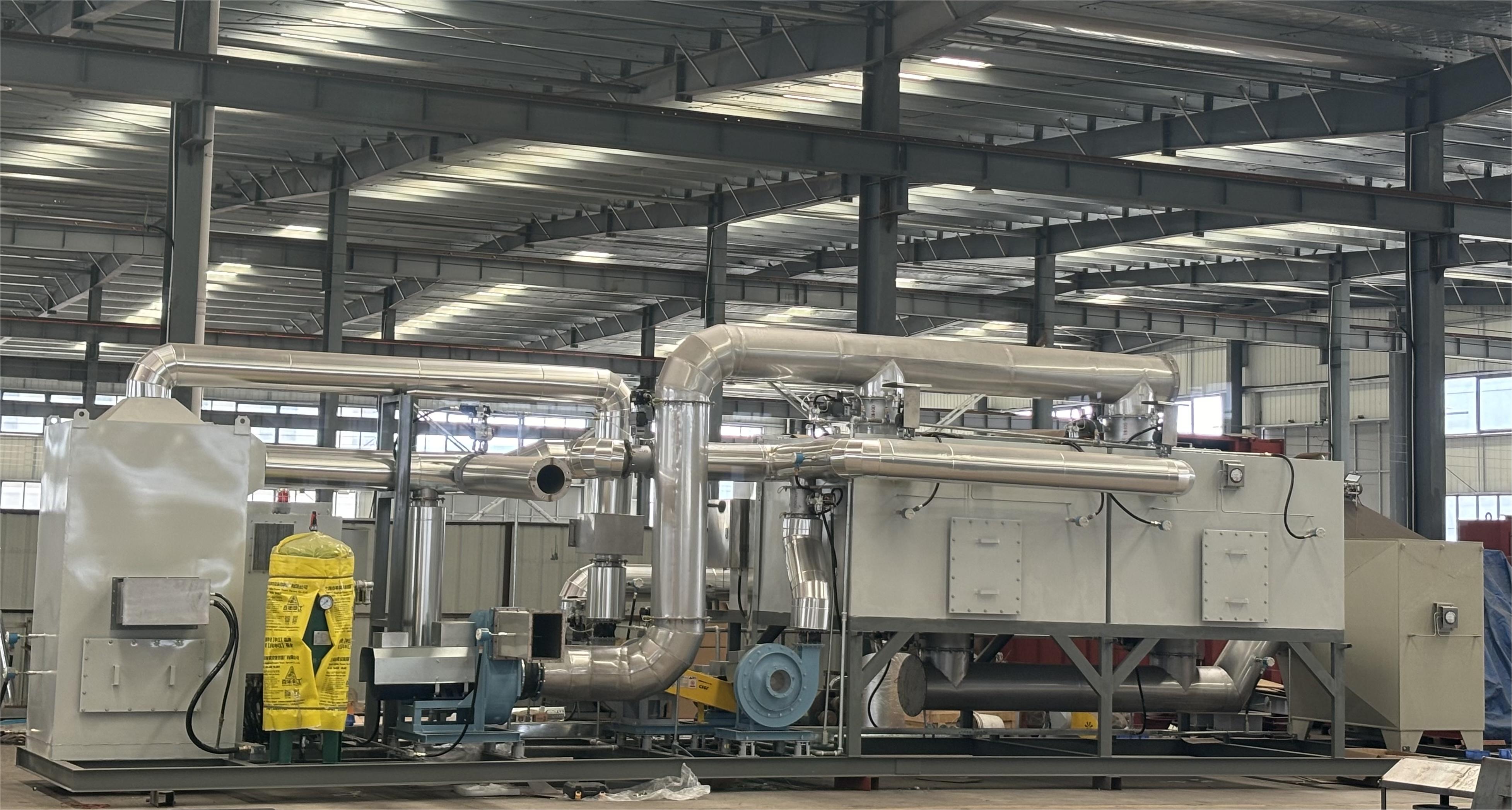 將吸附濃縮單元和熱氧化單元有機結合起來,有機廢氣先通過干式過濾,將廢氣中顆粒狀污染物截留去除,然后進入吸附床進行吸附,活性炭經過吸附運行一段時間后達到飽和,啟動系統的脫附催化燃燒過程,通過控制脫附過程流量可將有機廢氣濃度濃縮10-20倍,脫附氣流經催化床內設的電加熱裝置加熱至300℃左右,在催化劑作用下起燃,催化燃燒過程凈化效率可達97%以上,燃燒后生成CO2和H2O。