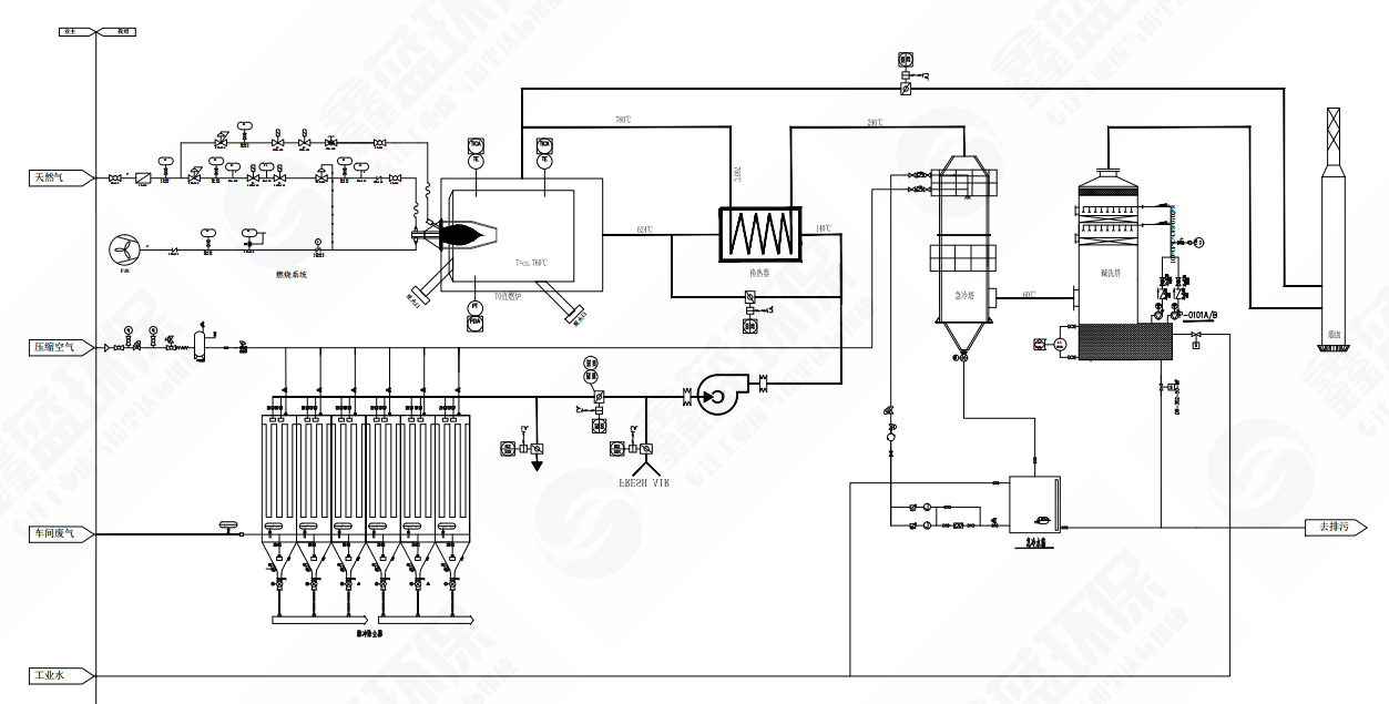 此次項目采用工藝為:布袋除塵器+TO直燃爐+急冷塔+堿洗塔