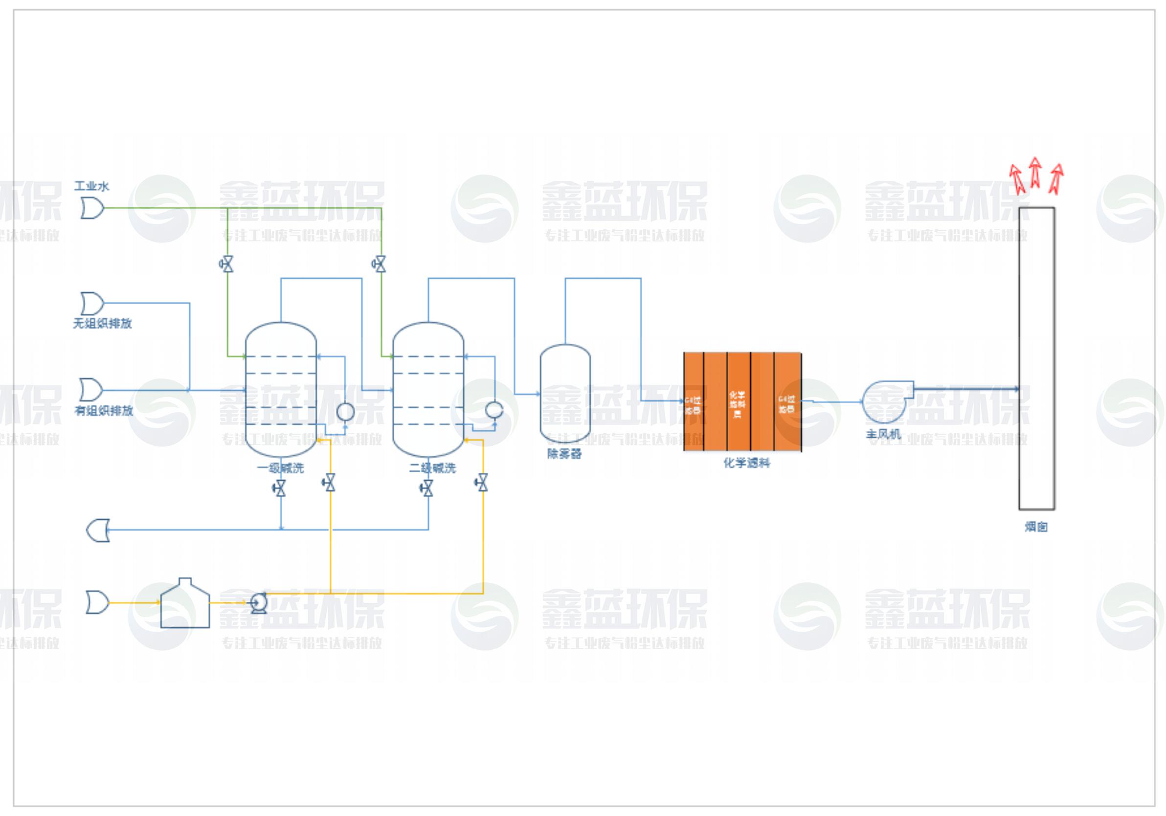 洗滌塔是應用廣泛的濕式預處理設備,可以有效地去除廢氣中的顆粒物。在本案中可以采用填料噴淋塔作為預處理,噴淋塔內安裝2層填料外加一層除霧層,循環水槽內存儲1-2m3的循環水循環使用。