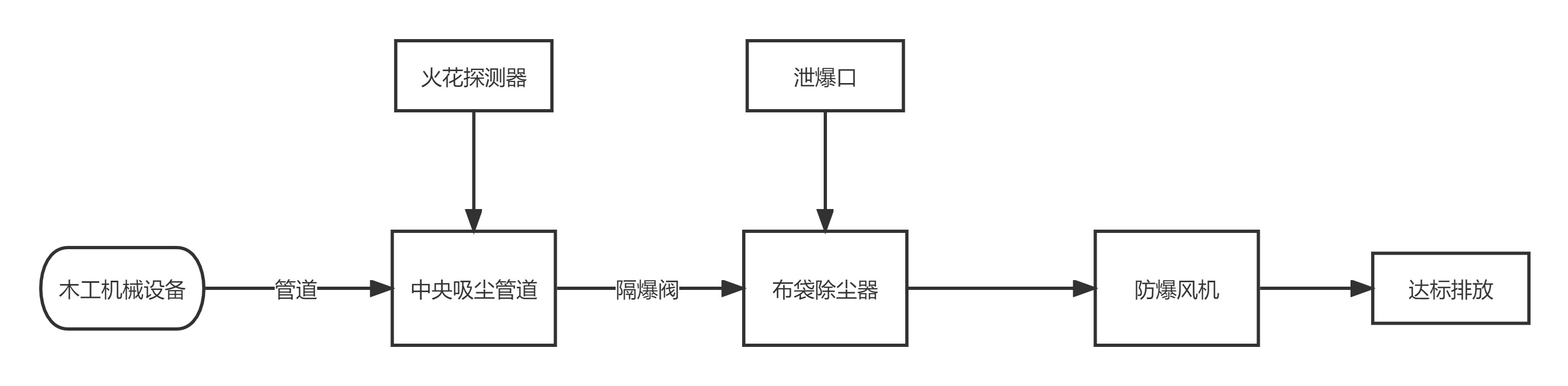 家具廠木工中央除塵系統的設計是以盡可能節省成本為原則。由于木工設備在加工過程中產生的粉塵濃度較大,采用常用的防爆脈沖布袋除塵技術,達到粉塵回收和廢氣凈化的目的,使各項排放指標均達到排放要求。