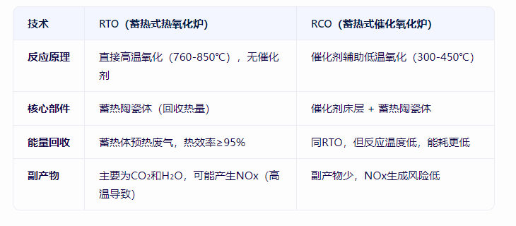 RTO(蓄熱式熱氧化爐)和RCO(蓄熱式催化氧化爐)是工業廢氣處理中常見的兩種技術,均通過高溫氧化分解有機廢氣(VOCs),但原理、適用工況及優缺點存在差異。以下是詳細對比: