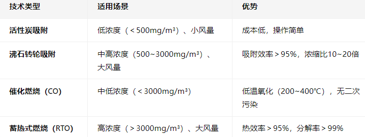 VOCs是涂裝廢氣的核心污染物,需根據(jù)風量、濃度、成分選擇技術: