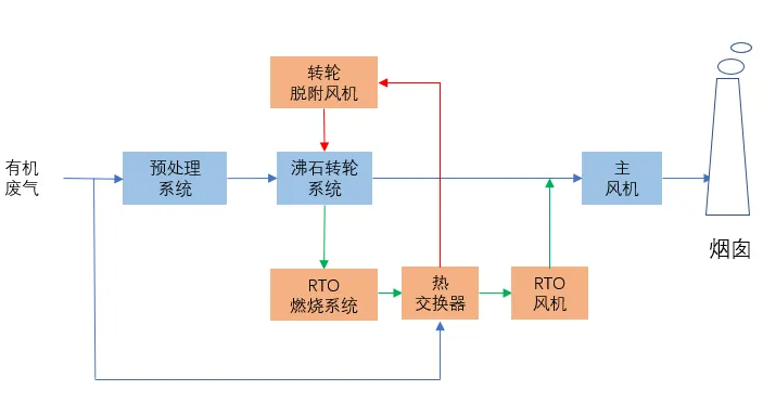 有機廢氣通過廢氣收集裝置將VOC廢氣,直接送入回轉RTO系統中進行高溫氧化分解。用高壓風機送入RTO焚燒設備。VOC廢氣在800℃高溫下完全分解為CO2和H2O并放出大量熱。燃燒后的高溫氣體用蜂窩狀陶瓷蓄熱體把熱能回收并存儲,用在廢氣預熱上,能回收的熱量95%以上。