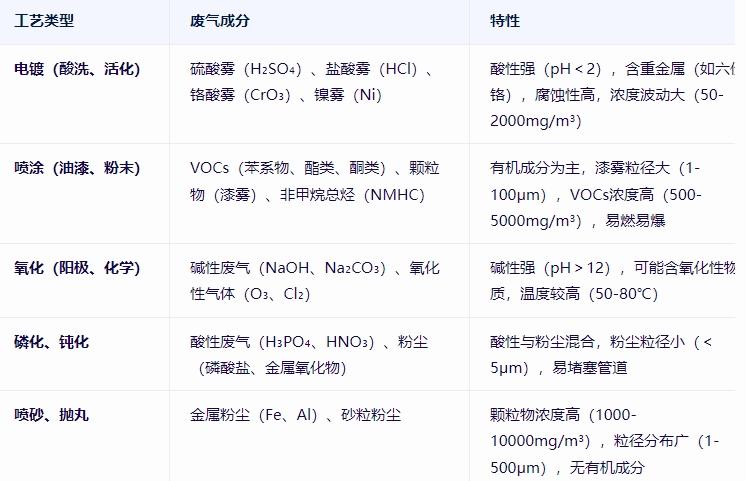 表面處理廢氣因工藝不同,成分差異顯著,常見類型及特性如下: