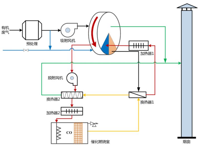 在有機廢氣處理組合工藝中,沸石轉輪濃縮吸附+催化燃燒裝置主要適用于廢氣風量大,濃度低的處理方式,其成分中不能含有S/N/Cl等元素,且成分能被沸石轉輪吸附且能脫附出來。