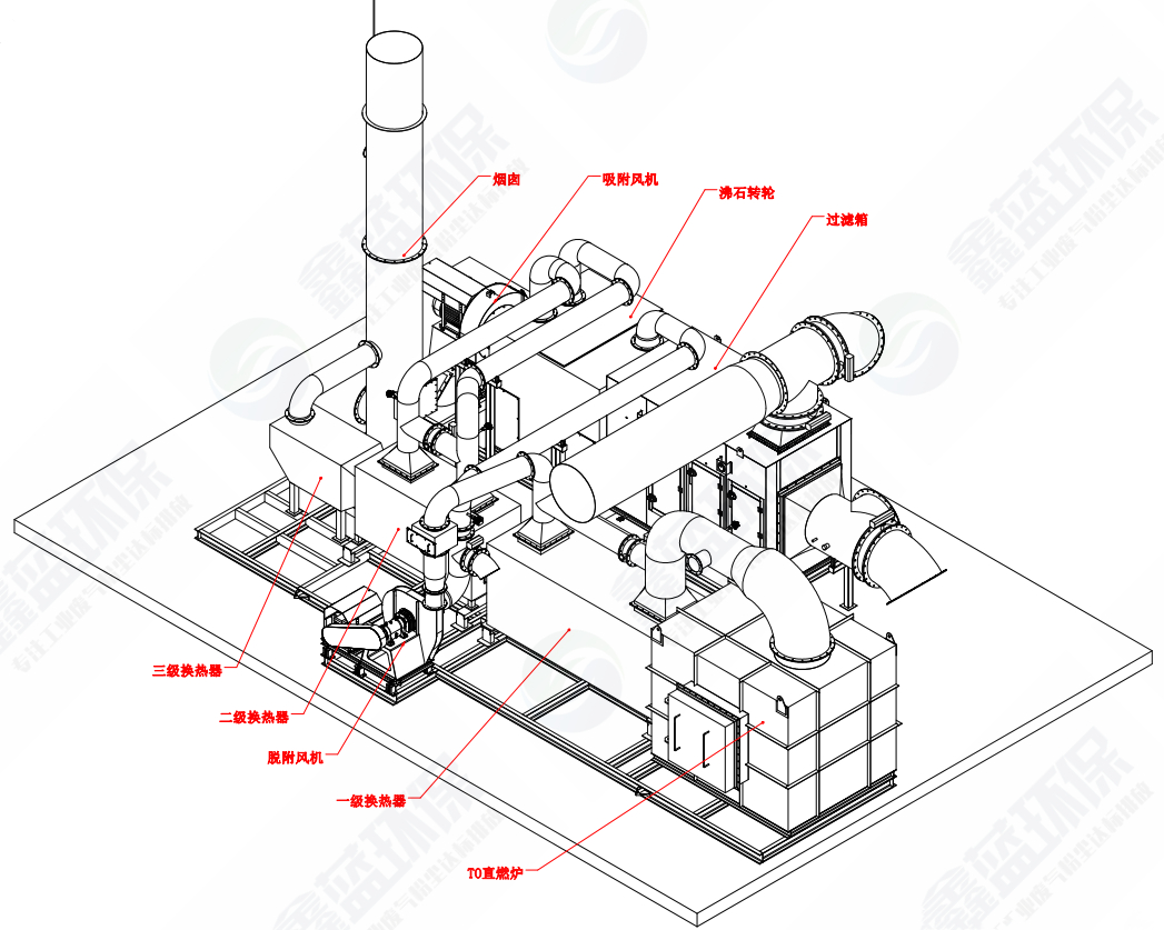 企業在生產過程中排放的VOCs尾氣進入沸石轉輪吸附,吸附后的潔凈氣體經煙囪達標排放,沸石轉輪廢氣入口處設置過濾器,去除廢氣中的顆粒物。冷卻氣通過沸石轉輪冷卻區預加熱后再經過熱交換器升溫到所需的脫附溫度,進入沸石轉輪的脫附區,脫除吸附在分子篩內的有機組分,脫附后的廢氣由脫附風機加壓進入TO爐進行直接燃燒。
